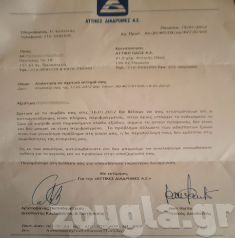 Η απάντηση από την Αττική Οδό ήρθε μέσω ενός εγγράφου στο οποίο αναφερόταν πως τα αδέσποτα είναι γενικότερα πρόβλημα της Ελλάδας και η περισυλλογή τους δεν συμπίπτει στις αρμοδιότητες της εταιρείας.