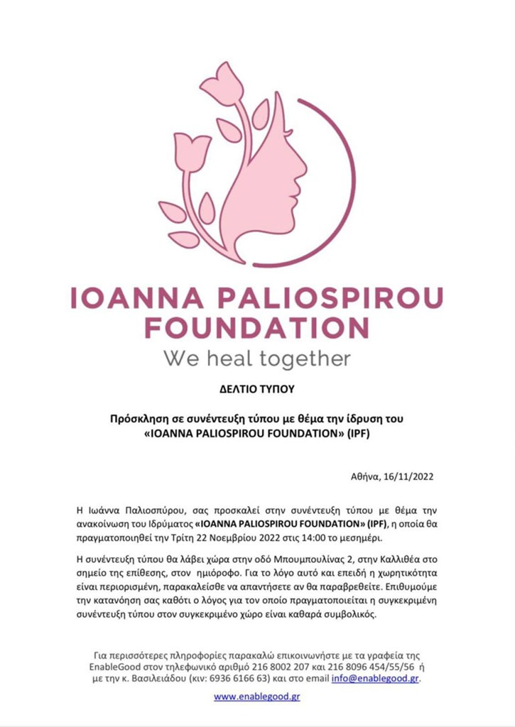 Η συνέντευξη Τύπου για την παρουσίαση του Ioanna Paliospyrou Foundation (IPF) θα γίνει την Τρίτη 22 Νοεμβρίου στις 14:00, στην Καλλιθέα.