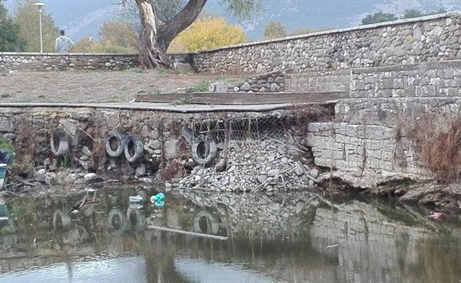 Συρματοκιβώτια που ουσιαστικά έχουν καταστραφεί και δεν συγκρατούν τα υλικά με τα οποία ήταν γεμάτα.