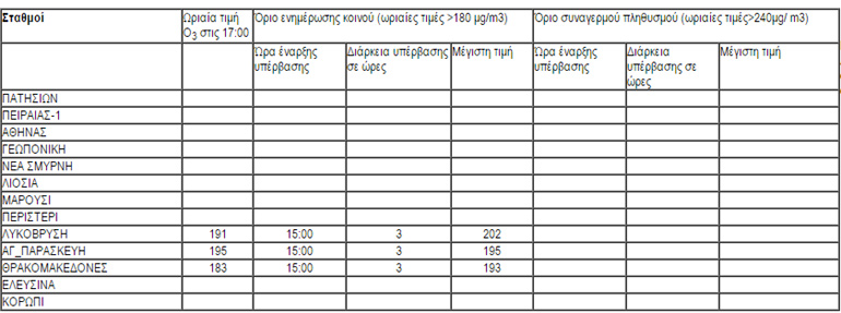 Το Υπουργείο Περιβάλλοντος και Ενέργειας ενημερώνει ότι: Σήμερα 14/06/2017 σύμφωνα με τις μετρήσεις του Δικτύου Παρακολούθησης Ατμοσφαιρικής Ρύπανσης της Αθήνας, υπήρξε υπέρβαση του ορίου ενημέρωσης (180 μg/m3) για το όζον. Πιο συγκεκριμένα, μέχρι τις 17:00 σημειώθηκαν οι εξής υπερβάσεις: