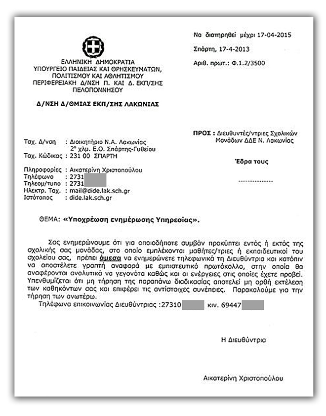 Με ένα «υπηρεσιακό» έγγραφο που δείχνει να έρχεται από εποχές που κανείς, -ή έστω σχεδόν κανείς- δεν θέλει να θυμάται, η «Διεύθυνση Δευτεροβάθμιας Εκπαίδευσης Λακωνίας» αποφασίζει και διατάσσει πως όλοι οι Διευθυντές/Διευθύντριες Σχολικών Μονάδων είναι υποχρεωμένοι να αναφέρουν ο,τιδήποτε υποπίπτει στην αντίληψή τους και αφορά σε εκπαιδευτικούς ή μαθητές «εντός και εκτός σχολείου».
