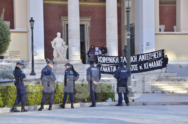 Η κατειλημμένη Πρυτανεία του ΕΚΠΑ από αλληλέγγυους των φυλακισμένων απεργών πείνας του ΔΑΚ (Δίκτυο Αγωνιστών Κρατουμένων), βρίσκεται και σήμερα υπό τον ασφυκτικό κλοιό της Αστυνομίας, η οποία συλλαμβάνει όσους πλησιάζουν στο κτίριο.