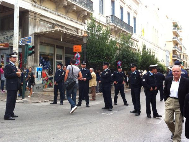 Σύμφωνα με το σχεδιασμό της τοπικής ΕΛ.ΑΣ., η εξέδρα των επισήμων που έχει στηθεί στην πλατεία Τριών Συμμάχων, στο ύψος της Αγίου Νικολάου, έχει αποκλειστεί με κιγκλιδώματα σε όλο το τετράγωνο.