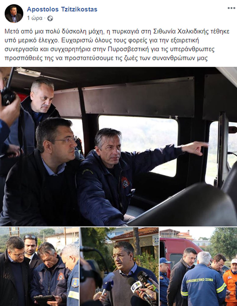 Σε ανάρτησή του στον προσωπικό του λογαριασμό στο Facebook ο περιφερειάρχης Κεντρικής Μακεδονίας ανέφερε: «Μετά από μια πολύ δύσκολη μάχη, η πυρκαγιά στη Σιθωνία Χαλκιδικής τέθηκε υπό μερικό έλεγχο. Ευχαριστώ όλους τους φορείς για την εξαιρετική συνεργασία και συγχαρητήρια στην Πυροσβεστική για τις υπεράνθρωπες προσπάθειές της να προστατεύσουμε τις ζωές των συνανθρώπων μας».