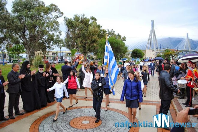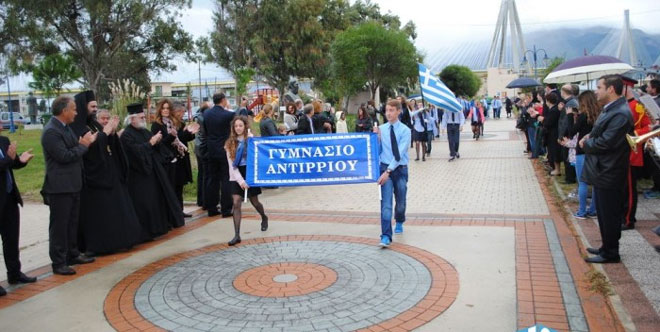 Οι άσχημες καιρικές συνθήκες δεν εμπόδισαν τους μαθητές των σχολείων και τη φιλαρμονική να παρελάσουν στην πλατεία Χόρμοβα στο Αντίρριο.