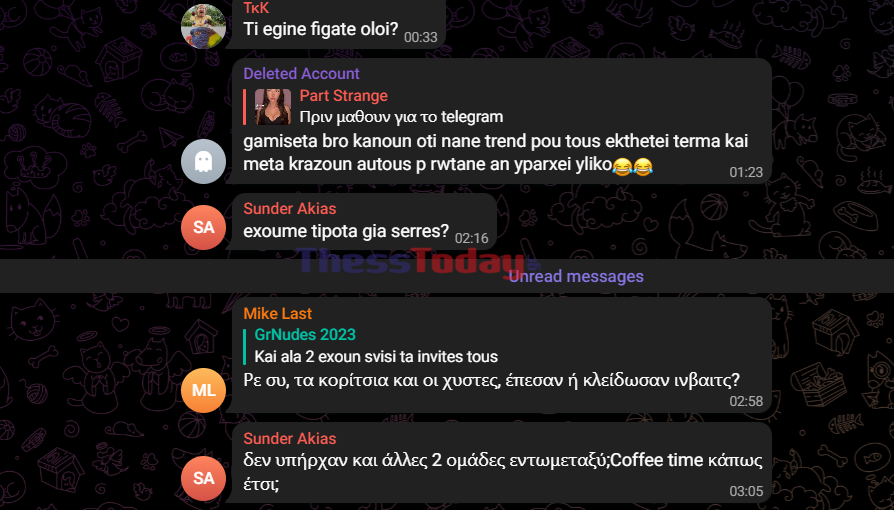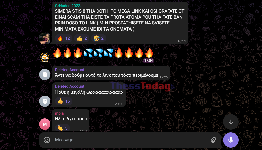 Στην ομάδα «GrNudes 2023» του Telegram στην οποία συμμετέχουν πάνω από 6.000 μέλη, ένας διαχειριστής γράφει σε ανακοίνωση πως «σήμερα στις 20:00, θα δοθεί mega link» με διάφορους χρήστες να του απαντάνε «άντε να δούμε αυτό το λινκ που τόσο περιμένουμε» και πως «ήρθε επιτέλους η μεγάλη ώρα».