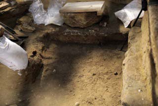1. Προχωρεί η απομάκρυνση χωμάτων από τον τέταρτο χώρο και αποκαλύφθηκε η θεμελίωση των πλαϊνών τοίχων. Η έδραση των τοίχων γίνεται επί τεχνητής επίχωσης, από καλά συμπυκνωμένο αμμοχάλικο με άργιλο, πάχους περίπου 0, 40μ. Η επίχωση αυτή πατά πάνω στο φυσικό έδαφος του λόφου Καστά, το οποίο εμφανίζεται επιφανειακά ως εδαφοποιημένος-κερματισμένος σχιστόλιθος.