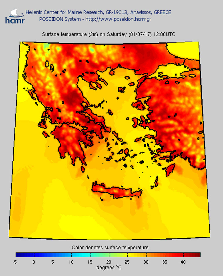 Αίθριος ο καιρός. Οι άνεμοι μεταβλητοί 2 με 4 μποφόρ και στα ανατολικά βόρειοι 4 μποφόρ. Η θερμοκρασία θα κυμανθεί από 23 έως 41 και κατά τόπους έως 43 βαθμούς Κελσίου.