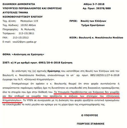 «Το Υπουργείο Περιβάλλοντος δεν γνωρίζει και δεν επιθυμεί να γνωρίζει πού εργάζονται οι σύζυγοι των στελεχών του Ελληνικού Κτηματολογίου».