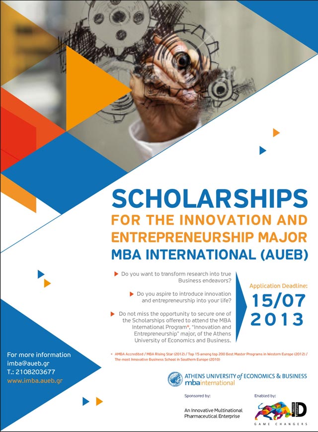 Το MBA International του Οικονομικού Πανεπιστημίου Αθηνών, με συνέπεια ως προς τη συστηματική ενίσχυση της επιχειρηματικότητας και της καινοτομίας στην Ελλάδα, ανακοινώνει τη χορήγηση αριθμού υποτροφιών για συμμετοχή στην κατεύθυνση «Innovation and Entrepreneurship» του full-time προγράμματος για το ακαδημαϊκό έτος 2013-2014. To συγκεκριμένο πρόγραμμα υποτροφιών πραγματοποιείται με πρωτοβουλία των Industry Disruptors – Game Changers (ID-GC), ενώ οι υποτροφίες (αξίας 12.000 ευρώ έκαστη) είναι ευγενική χορηγία μεγάλης και καινοτόμου πολυεθνικής φαρμακευτικής με σημαντική παρουσία στην Ελλάδα.