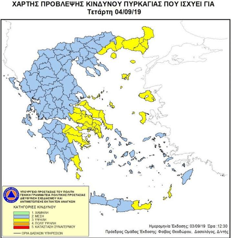 Συγκεκριμένα σύμφωνα με τον Χάρτη Πρόβλεψης Κινδύνου Πυρκαγιάς που εκδίδει η Γενική Γραμματεία Πολιτικής Προστασίας του υπουργείου Προστασίας του Πολίτη για την Τετάρτη 4 Σεπτεμβρίου 2019 προβλέπεται υψηλός κίνδυνος πυρκαγιάς για τις εξής περιοχές: