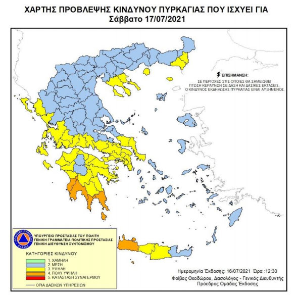 Υψηλός κίνδυνος πυρκαγιάς (επιπέδου 4) προβλέπεται για αύριο Σάββατο 17 Ιουλίου για την περιφέρεια Αττικής (ΠΕ Νήσων-Νήσος Κύθηρα), την περιφέρεια Πελοποννήσου (ΠΕ Λακωνίας, ΠΕ Μεσσηνίας) και την Περιφέρεια Κρήτης (ΠΕ Χανίων).