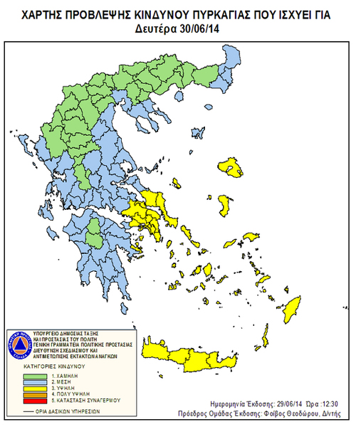 Σύμφωνα με το Χάρτη Πρόβλεψης Κινδύνου Πυρκαγιάς που εκδίδει η Γενική Γραμματεία Πολιτικής Προστασίας του Υπουργείου Δημόσιας Τάξης και Προστασίας του Πολίτη, για σήμερα Δευτέρα 30 Ιουνίου 2014, προβλέπεται υψηλός κίνδυνος πυρκαγιάς (κατηγορία κινδύνου 3) σε κάποιες περιοχές της Ελλάδας.