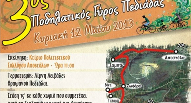 Ηράκλειο Κρήτης: «3ος ποδηλατικός γύρος Πεδιάδας» την Κυριακή 12 Μαΐου από τους Πολιτιστικούς Συλλόγους: Αποστολιανών, Ενεργών Πολιτών Σαμπά, Ζωφόρων, Βόνης, Γαλατά, Θραψανού, το Δήμο Μινώα Πεδιάδας, και το Europe Direct.