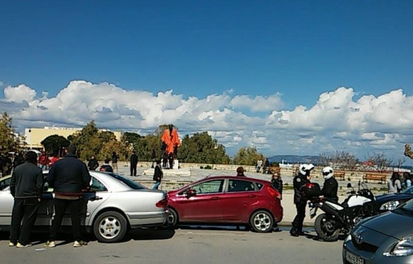 Σύμφωνα με πληροφορίες του cretapost.gr, πίσω από την κίνηση αυτή κρύβονται άτομα που πρόσκεινται στον αντιεξουσιαστικό χώρο. Με κουκούλες στο πρόσωπο πλησίασαν το άγαλμα και φόρεσαν στον ανδριάντα ένα πορτοκαλί πανί.