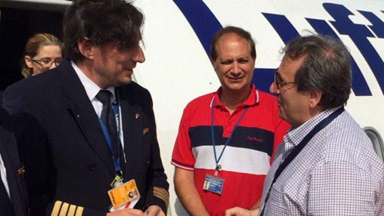 Η υποδοχή που επεφύλαξαν οι τοπικές αρχές στην πτήση ήταν εντυπωσιακή, με το πλήρωμα αλλά και τους τουρίστες να απολαμβάνουν σουβλάκια -επιθυμία του πιλότου- και παραδοσιακά εδέσματα.