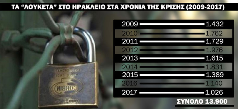 Χαρακτηριστικό είναι το γεγονός ότι από το 2009 έως και το 2017 έχουν κλείσει συνολικά 13.900 επιχειρήσεις μόνο στο νομό Ηρακλείου.
