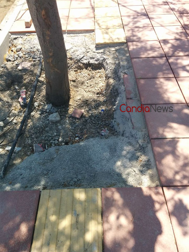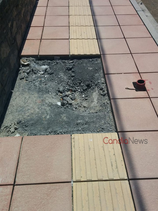 Όπως αποκαλύπτουν οι φωτογραφίες που έφερε στη δημοσιότητα το candianews.gr, οι υπεύθυνοι κατασκευής του έργου «φροντίζουν» ώστε οι τυφλοί να οδηγούνται σε παρτέρια και κολόνες…