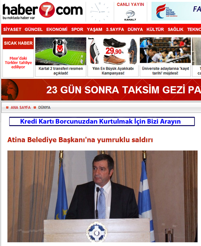 Η ηλεκτρονική εφημερίδα «Haber 7» σε σχετικό άρθρο της που φέρει τίτλο «Επίθεση με γροθιές στον δήμαρχο της Αθήνας» εξηγεί τα όσα διαδραματίστηκαν έπειτα από τη χθεσινή συνεδρίαση της ΚΕΔΕ.