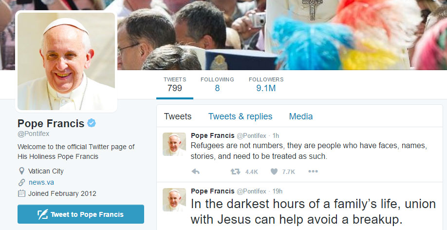 Ο πάπας Φραγκίσκος έχει πάρα πολλούς τρόπους να επικοινωνεί με τους πιστούς. Ένας από αυτούς είναι το Twitter του (@Pontifex) που έχει 10 εκατομμύρια ακολούθους.