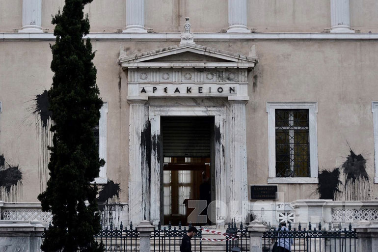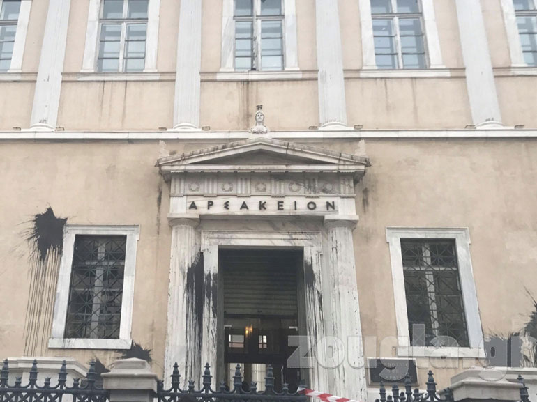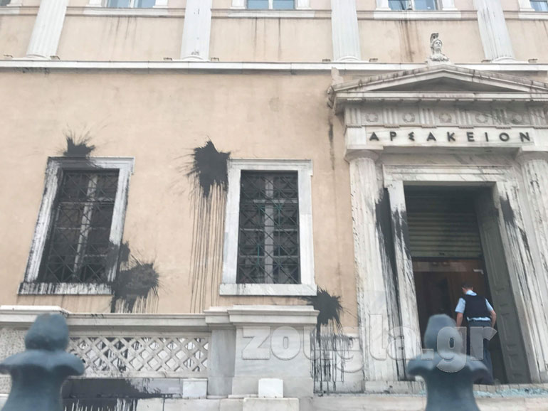 Τα μέλη του Ρουβίκωνα δεν κατάφεραν να διακόψουν τη συνεδρίαση των ανώτατων δικαστικών. Προκάλεσαν, όμως, ζημιές, πέταξαν μπογιές και τρικάκια και λίγα λεπτά αργότερα αποχώρησαν.