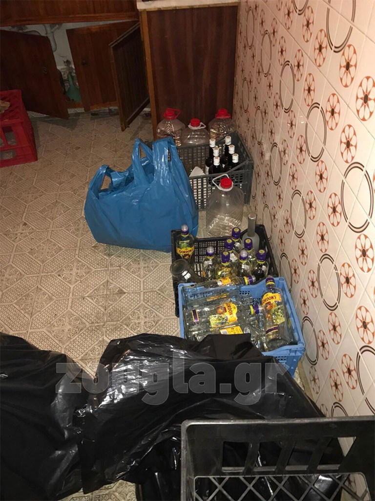 – ποσότητα αλκοολούχου ποτού αγνώστου προελεύσεως και ποιότητας, συσκευασμένου σε δοχεία 5 λίτρων χωρίς σήμανση, το οποίο προοριζόταν για επαναγέμιση των κενών φιαλών με σήματα γνωστών εταιρειών και