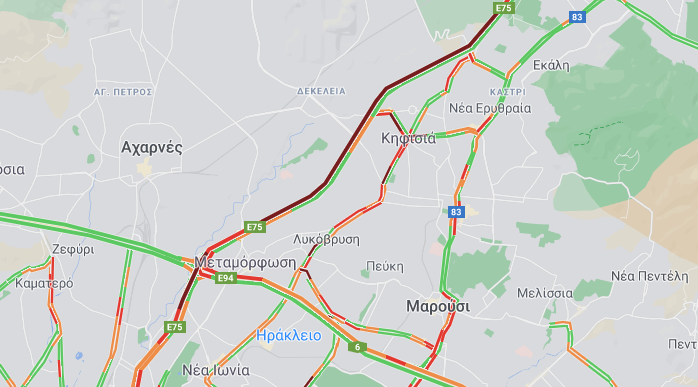 Καθυστερήσεις 10΄ – 15΄ από τον κόμβο Ηρακλείου έως την έξοδο 8 Αθηνών-Λαμίας στο ρεύμα προς Ελευσίνα. Παραμένουν οι καθυστερήσεις από τον κόμβο Πεντέλης έως τον κόμβο Κηφισίας στο ρεύμα προς Ελευσίνα.