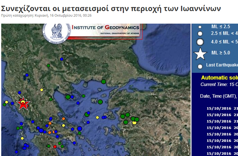 Ισχυρή σεισμική δόνηση μεγέθους 5,2 βαθμών της κλίμακας Ρίχτερ σημειώθηκε το βράδυ του Σαββάτου στις 23.14, 12 χιλιόμετρα βορειοδυτικά των Ιωαννίνων και 330 χιλιόμετρα βορειοδυτικά της Αθήνας, σύμφωνα με την επίσημη ανακοίνωση του Γεωδυναμικού Ινστιτούτου του Εθνικού Αστεροσκοπείου Αθηνών.
