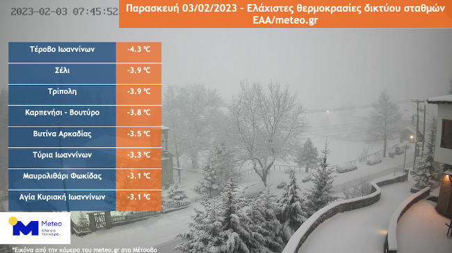 Από το meteo.gr δόθηκε και ο παρακάτω πίνακας με τις χαμηλότερες θερμοκρασίες που καταγράφηκαν το πρωί της Παρασκευής στη χώρα: