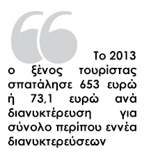 Συγκεκριμένα, ένας αλλοδαπός τουρίστας το 2013 ξόδεψε 653 ευρώ ή 73,1 ευρώ ανά διανυκτέρευση για σύνολο περίπου εννέα διανυκτερεύσεων. Σύμφωνα με τη σχετική έρευνα, παρότι η δαπάνη της περυσινής χρονιάς είναι αυξημένη κατά 1,2% σε σύγκριση με το 2012, είναι χαμηλότερη σε ποσοστό 10,5% από το 2008, οπότε διαμορφωνόταν στα 730 ευρώ.