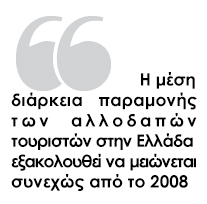 Την ίδια στιγμή, η μέση διάρκεια παραμονής των αλλοδαπών τουριστών στην Ελλάδα εξακολουθεί να μειώνεται συνεχώς από το 2008. Από 9,6 ημέρες που ήταν το 2008 έχει μειωθεί σε 8,9 το 2013. Από τις χώρες της ΕΕ το 2013 τη μεγαλύτερη ταξιδιωτική δαπάνη την έχουν οι Αυστριακοί τουρίστες με 898 ευρώ κατά ταξίδι και ακολουθούν οι Γερμανοί με 838 ευρώ κατά ταξίδι. Τη μεγαλύτερη διάρκεια παραμονής όμως την έχουν οι Γερμανοί τουρίστες με 12,8 διανυκτερεύσεις και ακολουθούν οι Βρετανοί με 10,2 διανυκτερεύσεις.
