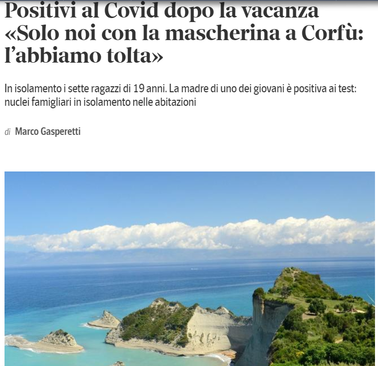 Επτά 19χρονοι Ιταλοί ήρθαν στην Κέρκυρα για διακοπές και κόλλησαν… κορωνοϊό, όπως αναφέρει η ιταλική εφημερίδα Corriere della Sera.