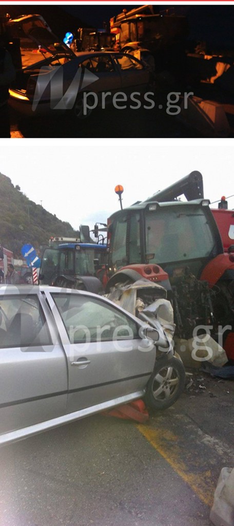Γύρω στις 06.30, αυτοκίνητο μάρκας Scoda Octavia που οδηγούσε ξένος υπήκοος, με κατεύθυνση το Αντίρριο, προσέκρουσε με μεγάλη ταχύτητα σε σταθμευμένο τρακτέρ του μπλόκου. Η σύγκρουση ήταν σφοδρή, ενώ ο οδηγός γλύτωσε με ελαφρά τραύματα, καθώς έπεσε πάνω στη ρόδα του αγροτικού οχήματος.