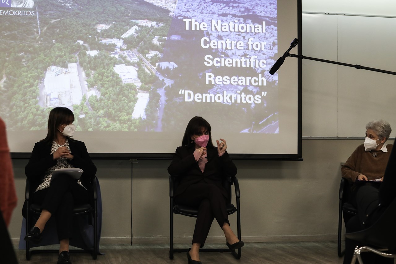 Η κ. Σακελλαροπούλου μετέβη στην αίθουσα διαλέξεων του Ινστιτούτου, όπου είχε συνάντηση με γυναίκες ερευνήτριες του Δημόκριτου και μαθήτριες της Γ΄ Λυκείου γειτονικών σχολείων (1ο Λύκειο Αγίας Παρασκευής, Pierce και Ελληνογαλική Σχολή- Eugene Delacroix) που έχουν επιλέξει την θετική-τεχνολογική κατεύθυνση για τις σπουδές τους.