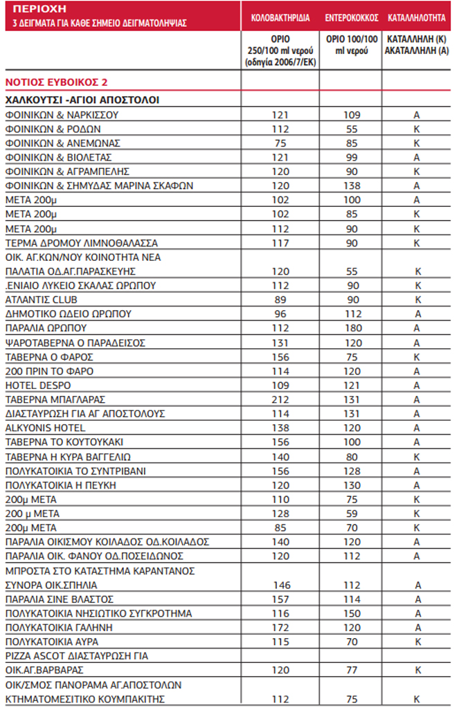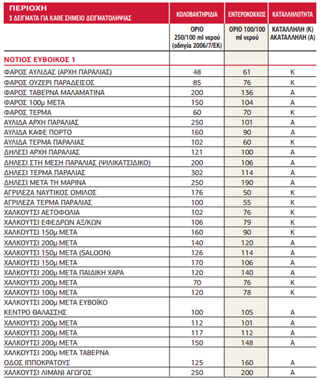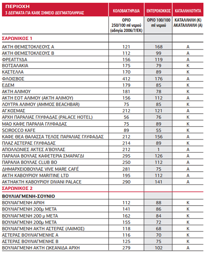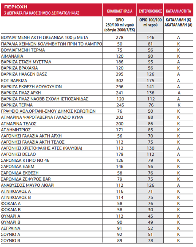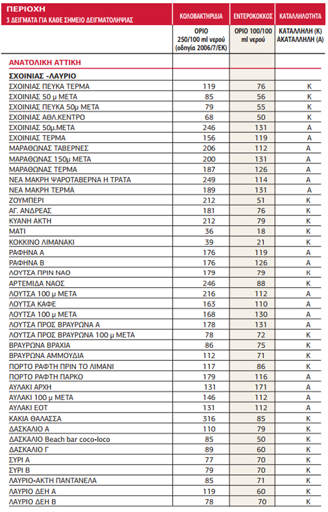Στους παρακάτω αναλυτικούς πίνακες, που αφορούν τις ακτές της Αττικής, του Ευβοϊκού και Κορινθιακού, δεν φαίνεται απλώς η καταλληλότητα ή μη της κάθε ακτής, αλλά και ο βαθμός της όποιας καθαρότητας, καθώς παρατίθενται αναλυτικά και οι τιμές για τα κολοβακτηρίδια και τον εντερόκοκκο ανά όγκο νερού.