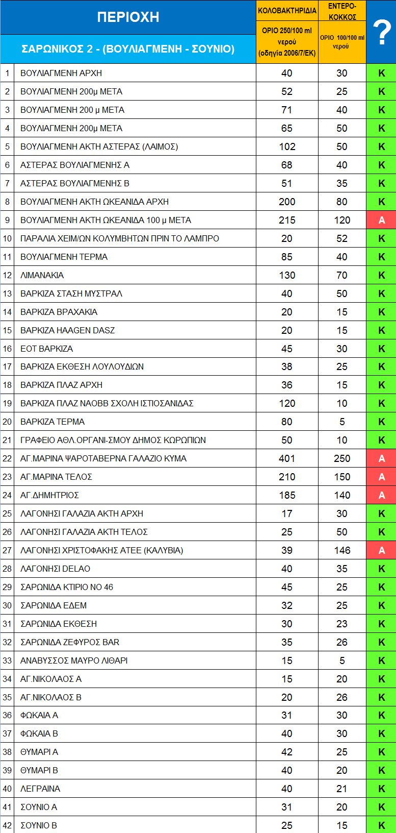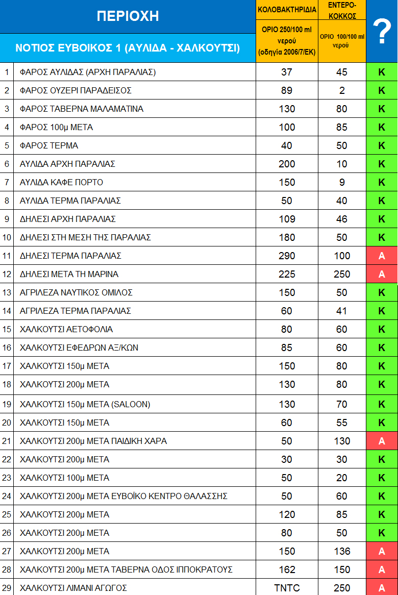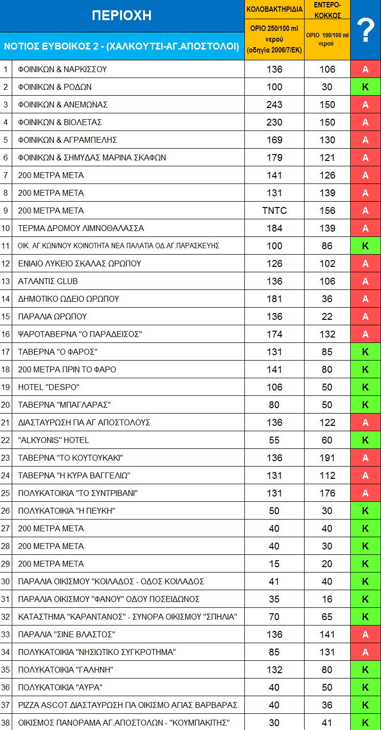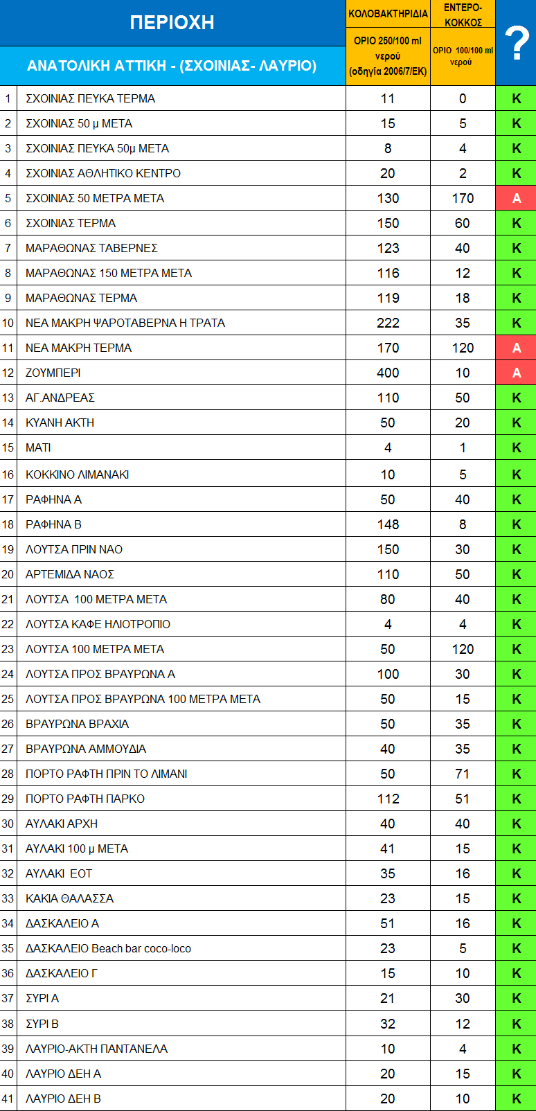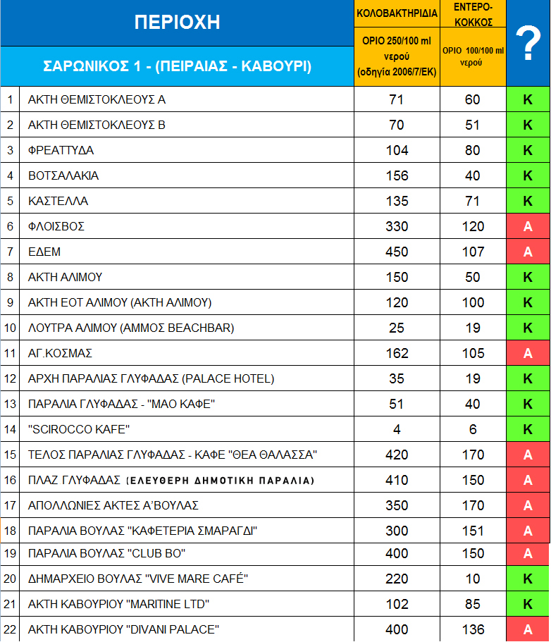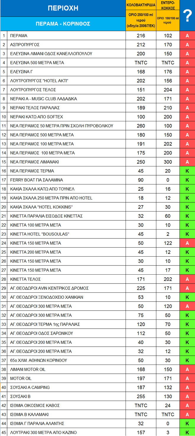 Στους παρακάτω αναλυτικούς πίνακες, που αφορούν τις ακτές της Αττικής, του Ευβοϊκού και Κορινθιακού, δεν φαίνεται απλώς η καταλληλότητα ή μη της κάθε ακτής, αλλά και ο βαθμός της όποιας καθαρότητας, καθώς παρατίθενται αναλυτικά και οι τιμές για τα κολοβακτηρίδια και τον εντερόκοκκο ανά όγκο νερού.