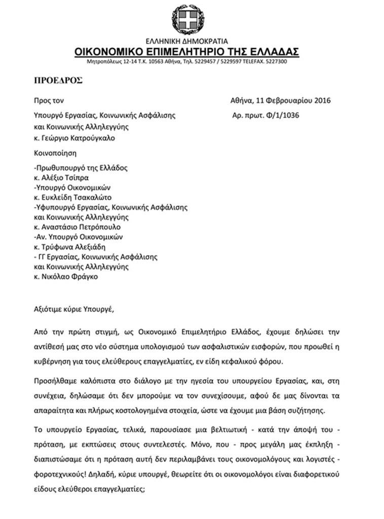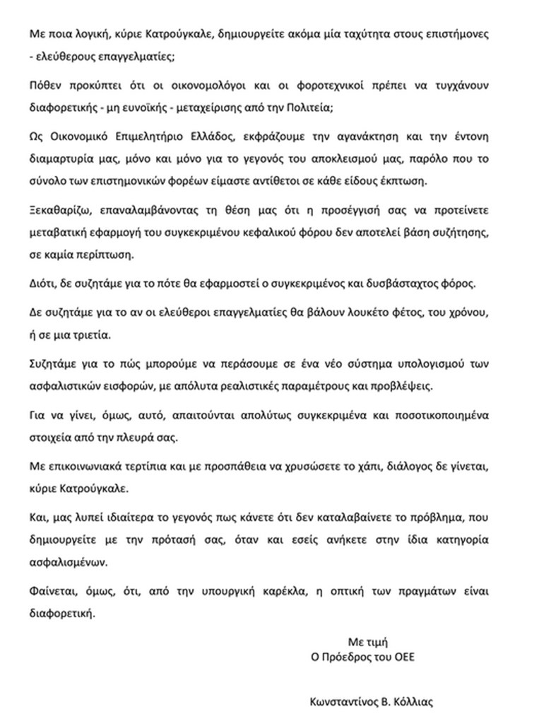 Μάλιστα, ο πρόεδρος του Ο.Ε.Ε. Κωνσταντίνο Κόλλιας εκφράζοντας την έντονη αντίδραση και αγανάκτηση των οικονομολόγων και λογιστών-φοροτεχνικών απέστειλε επιστολή του προς τον υπουργό εργασίας, Γιώργο Κατρούγκαλο. Στην επιστολή η οποία κοινοποιείται στο γραφείο του Πρωθυπουργού και στα συναρμόδια κυβερνητικά στελέχη ο κ. Κόλλιας διατυπώνει την έκπληξή του για το γεγονός ότι το υπουργείο εργασίας απέκλεισε τους οικονομολόγους και λογιστές – φοροτεχνικούς από την νέα πρόταση που κατέθεσε προς τους επιστημονικούς φορείς, δημιουργώντας έτσι επιστήμονες ελευθέρους επαγγελματίες δύο ταχυτήτων.