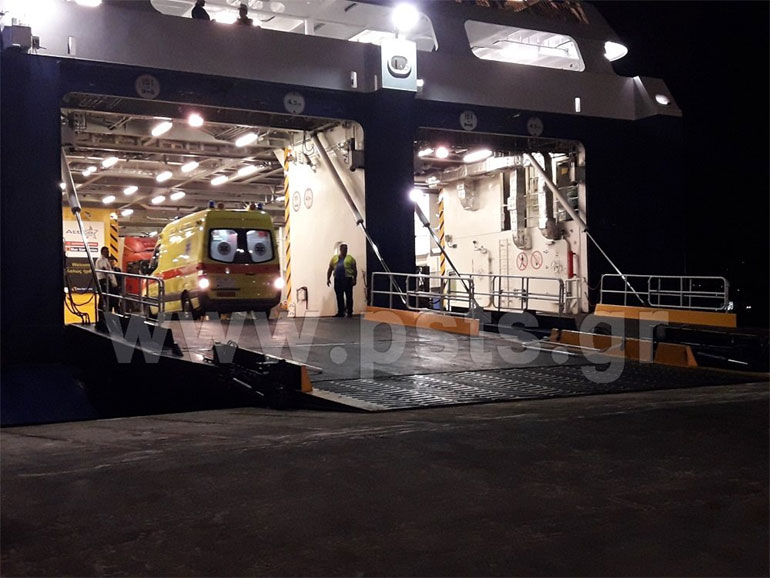 Η ηλικιωμένη γυναίκα διακομίσθηκε στο πλοίο με ασθενοφόρο του ΕΚΑΒ.
