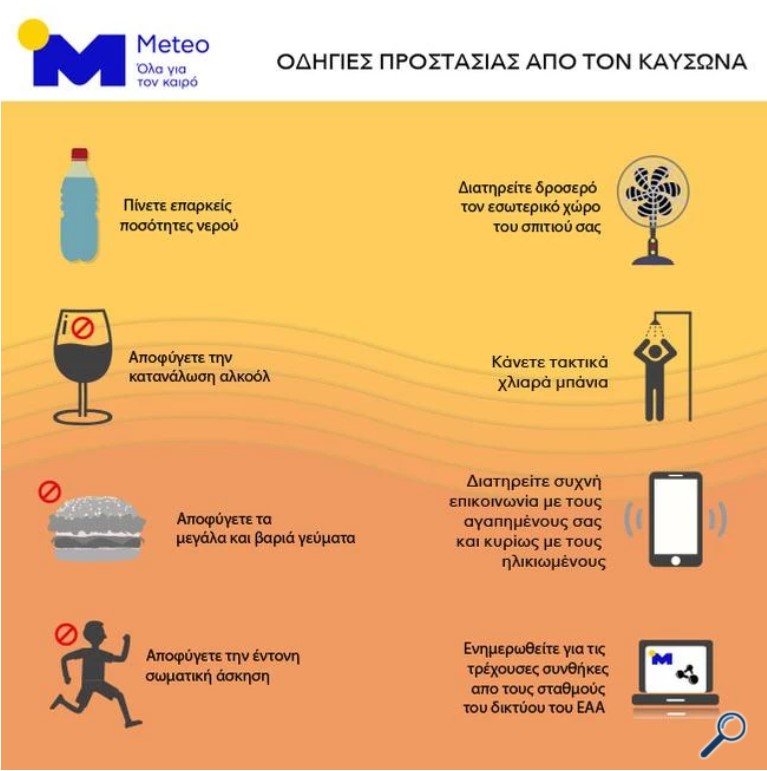 Λόγω των δυσμενών συνθηκών που θα δημιουργηθούν από τις υψηλές θερμοκρασίες, κυρίως στα αστικά κέντρα, το Εθνικό Αστεροσκοπείο Αθηνών, τονίζει πως θα πρέπει να τηρούνται τα απαραίτητα μέτρα προφύλαξης, τα κυριότερα εκ των οποίων παρουσιάζονται συνοπτικά στο παρακάτω γράφημα.