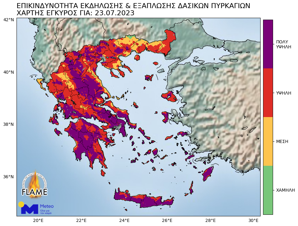 Πολύ υψηλός κίνδυνος πυρκαγιάς (κατηγορία κινδύνου 4) προβλέπεται για το Σάββατο 22 Ιουλίου, για επτά περιφέρειες της χώρας, σύμφωνα με το Χάρτη Πρόβλεψης Κινδύνου Πυρκαγιάς που εκδίδει η γενική γραμματεία Πολιτικής Προστασίας του υπουργείου Κλιματικής Κρίσης και Πολιτικής Προστασίας (civilprotection.gov.gr).