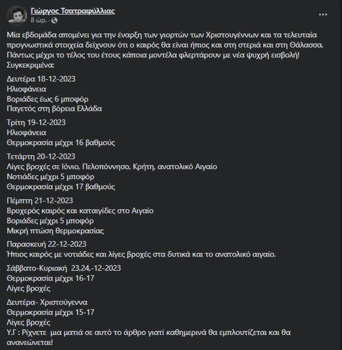 «Μία εβδομάδα απομένει για την έναρξη των γιορτών των Χριστουγέννων και τα τελευταία προγνωστικά στοιχεία δείχνουν ότι ο καιρός θα είναι ήπιος και στη στεριά και στη θάλασσα. Πάντως μέχρι το τέλος του έτους κάποια μοντέλα φλερτάρουν με νέα ψυχρή εισβολή!», σημειώνει ο γνωστός μετεωρολόγος και παραθέτει στοιχεία για την προσεχή εβδομάδα: