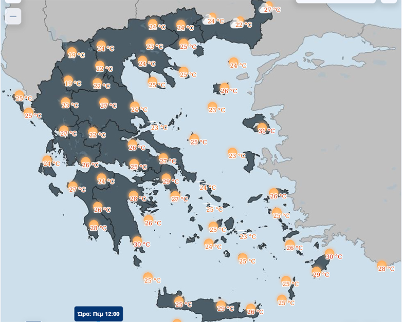 Θερμοκρασία: Από 24 έως 30 και στη νότια Κρήτη τοπικά έως 32 βαθμούς Κελσίου.