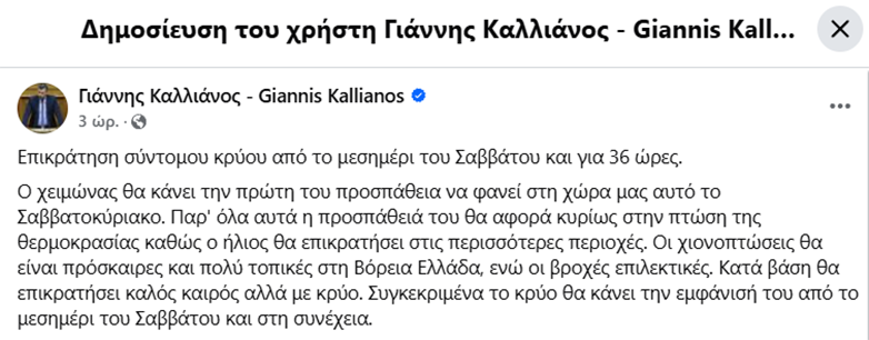 «Επικράτηση σύντομου κρύου για 36 ώρες» έγραψε χαρακτηριστικά σε ανάρτησή του για τον καιρό των επόμενων ημερών ο μετεωρολόγος Γιάννης Καλλιάνος, σημειώνοντας, πως η θερμοκρασία θα υποχωρήσει ξαφνικά από το μεσημέρι του Σαββάτου πρώτα στη Βόρεια Ελλάδα και την Κυριακή και στις υπόλοιπες περιοχές της χώρας.
