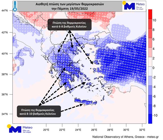 Τις μεσημεριανές ώρες της Πέμπτης 19/05 ο καιρός θα παρουσιάσει βελτίωση στις περισσότερες περιοχές. Ιδιαίτερα αισθητή θα είναι ωστόσο η πτώση των μεγίστων θερμοκρασιών της Πέμπτης 19/05, συγκριτικά με τις αντίστοιχες της Τετάρτης, πτώση η οποία όπως φαίνεται στον προγνωστικό χάρτη που ακολουθεί θα είναι της τάξης των 8-10 βαθμών Κελσίου.