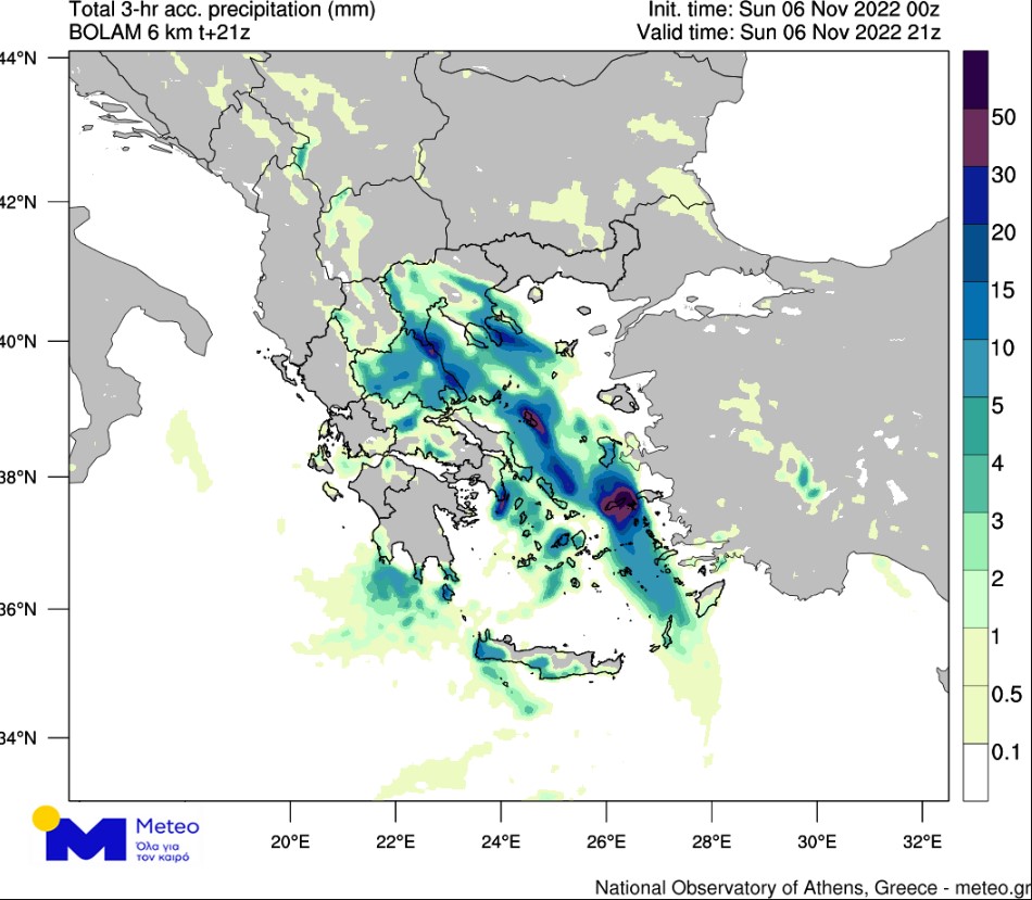 δ) από νωρίς το απόγευμα της Κυριακής (06-11-22) μέχρι και τις πρώτες πρωινές ώρες της Δευτέρας (07-11-22) στο ανατολικό Αιγαίο από την περιοχή Σάμου-Ικαρίας και νοτιότερα μέχρι και τα Δωδεκάνησα».
