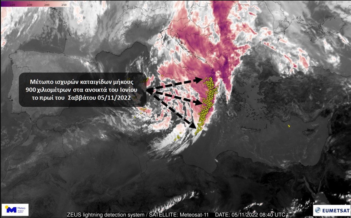 Στη δορυφορική εικόνα που ακολουθεί φαίνεται η θέση και το μήκος του μετώπου. Με κίτρινα σύμβολα αποτυπώνονται οι ανιχνευόμενες ηλεκτρικές εκκενώσεις από το σύστημα ΖΕΥΣ του Εθνικού Αστεροσκοπείου Αθηνών.