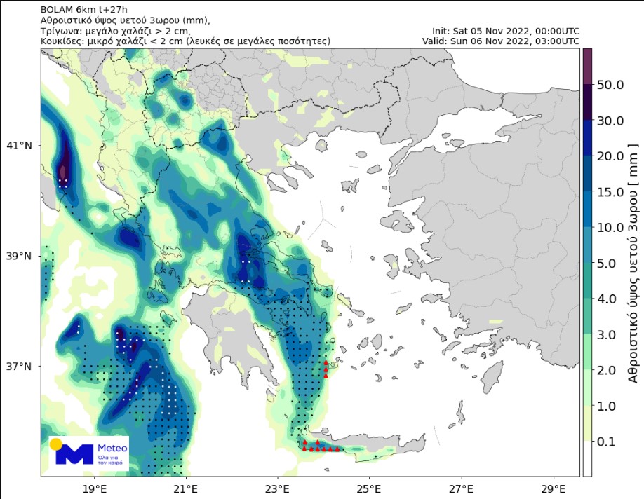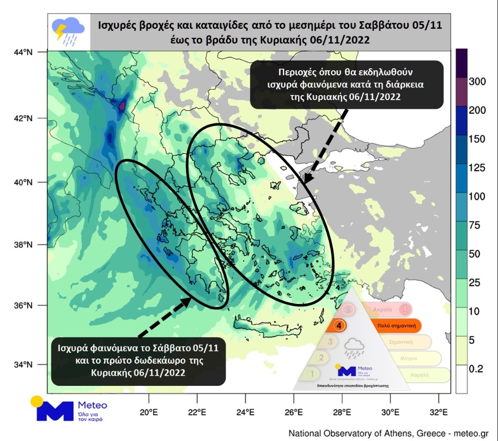 Η Αττική θα επηρεαστεί κατά διαστήματα από αργά το βράδυ του Σαββάτου έως το μεσημέρι της Κυριακής (06-11-2022), ενώ στην υπόλοιπη χώρα την Κυριακή ισχυρές βροχές και καταιγίδες θα εκδηλώνονται: α) μέχρι το μεσημέρι στο Ιόνιο, β) μέχρι το απόγευμα στην ηπειρωτική χώρα (πλην της Θράκης), γ) από τις πρωινές ώρες στις Κυκλάδες, την Κρήτη και τις Σποράδες και δ) από το μεσημέρι στα Δωδεκάνησα».