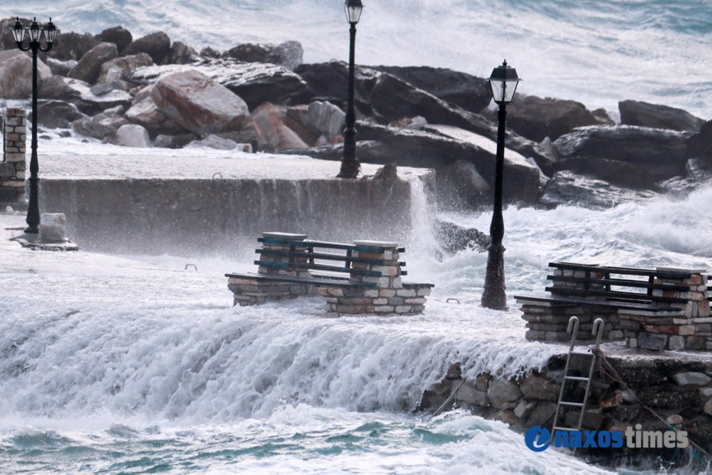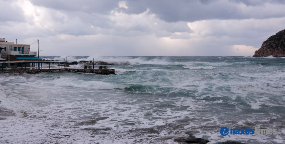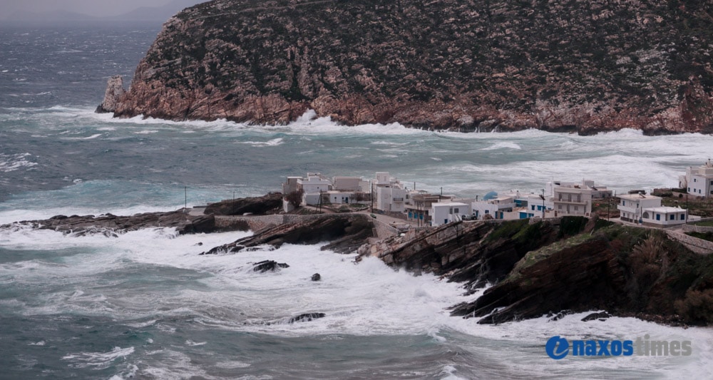 Θυελλώδεις άνεμοι 9-10 μποφόρ σαρώνουν την περιοχή, όπως και τη Νάξο γενικότερα, και τεράστια κύματα «καταπίνουν» το μικρό λιμάνι του παραλιακού οικισμού της Κορωνίδας.