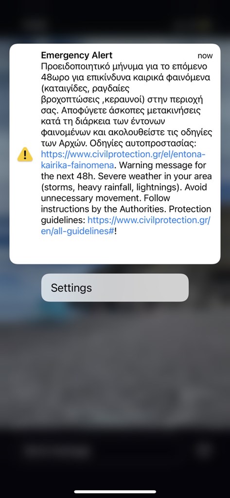 Επείγουσα ειδοποίηση από το 112 για επικίνδυνα καιρικά φαινόμενα έλαβαν πριν από λίγη ώρα στα κινητά τους κάτοικοι περιοχών που θα πληγούν από την κακοκαιρία το επόμενο 48ωρο.