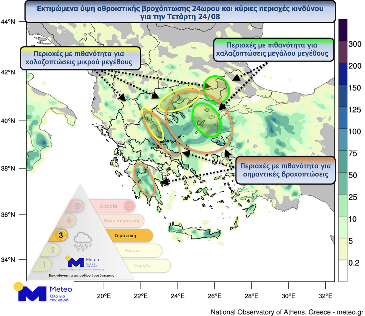 Ο παρακάτω χάρτης δείχνει τον αθροιστικό υετό που αναμένεται κατά τη διάρκεια της Τετάρτης 24/8 και συνοψίζει τις κυριότερες περιοχές υψηλού κινδύνου.